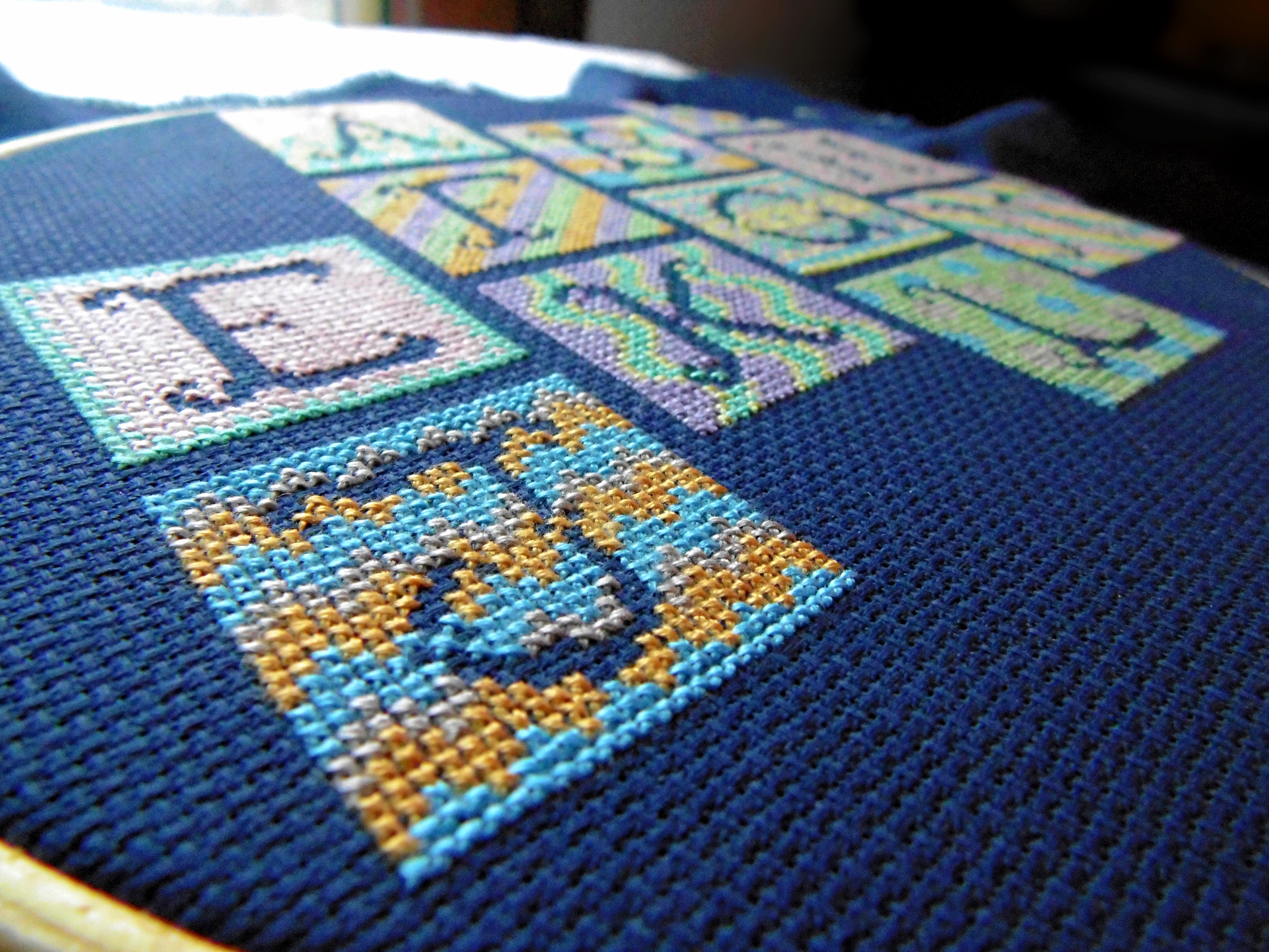 Now I am trying to create embroideries of my own design, I have come to appreciate cross stitch all over again. It is the perfect form for my fair isle inspired patterns. I have found it bold and vivid and a great way to play with colour. All of this, and my work creating shapes using negative space gave me a new idea. I decided to create a patchwork of lots of little cross stitch patterns and making them into an alphabet sampler. I chose a bright but slightly softer palette of colours for this project. In all there are eight colours but if I were to do this all over again I think I would throw in a couple more – twenty six patches plus a couple more to even the whole shape up is quite a lot to cover!