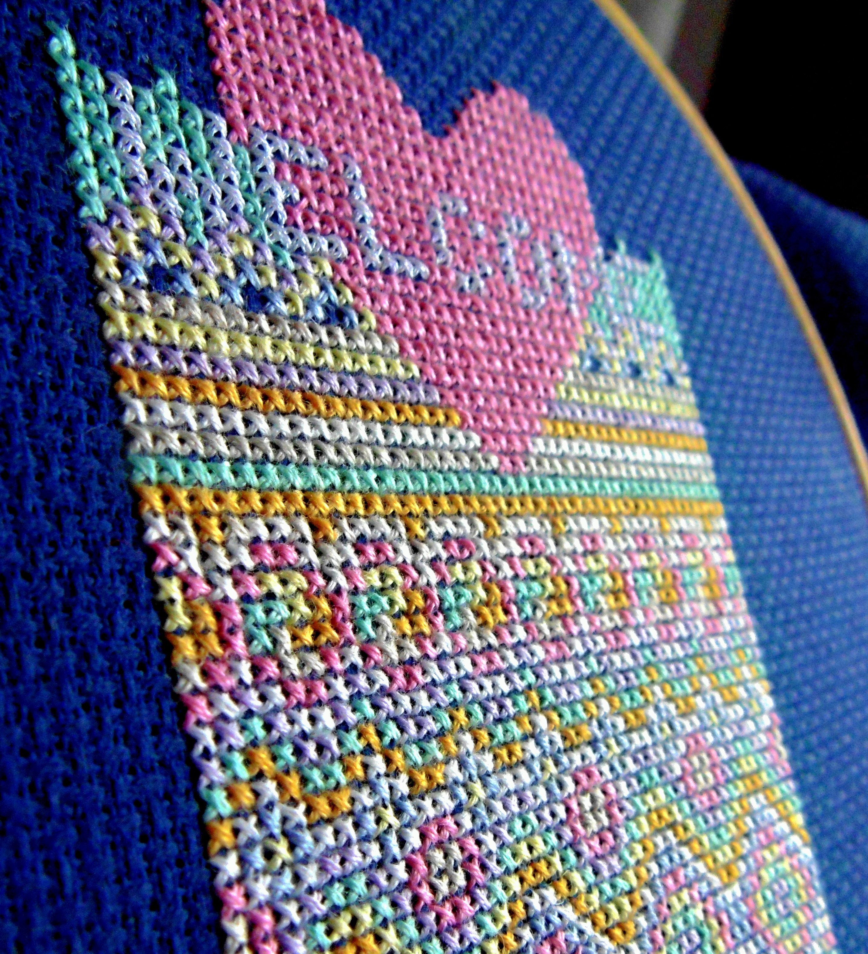 My my idea is to work the whole things in satin stitch.  The whole background will be blue and white stripes.  The words and the flowers are in satin stitch that is worked in a different direction to the stripes making you want to run your fingers all over it.  I am hoping the overall effect will be a bit like cloisonné.  We shall see.  To try and get an even result, I am using two strands of floss which means this will take forever! Expect this one to be part of the Weekend WIP Round Up for some time to come.