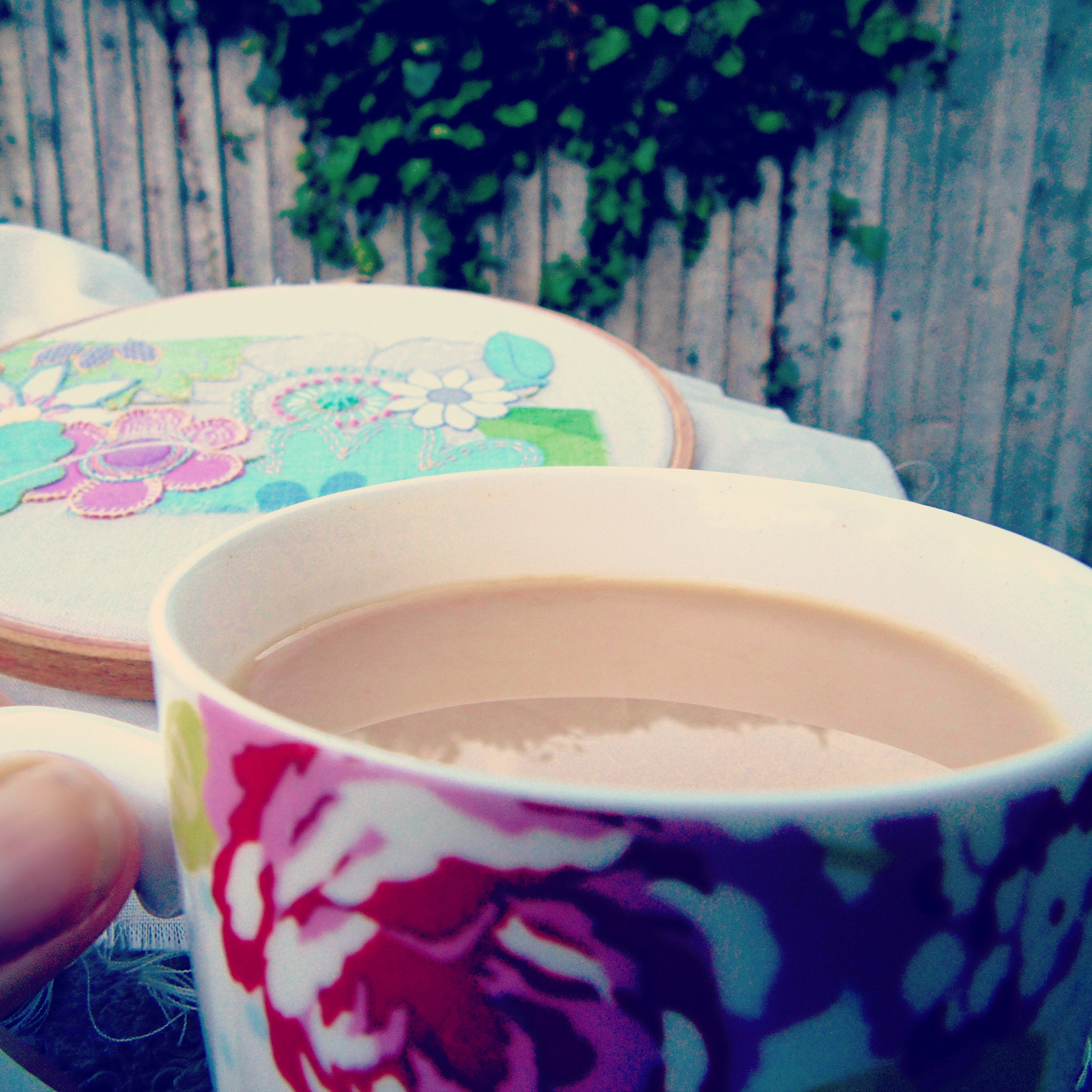 So this morning I embraced all things English. I took my tea (not coffee!) into my mum and dad’s garden and breathed in the cool air. I had to wrap myself up in a blanket because, of course, being England it wasn’t particularly warm! But it was bright and peaceful and allowed me a little stitching time. It was the perfect interlude before all of the busyness of the next few days.
