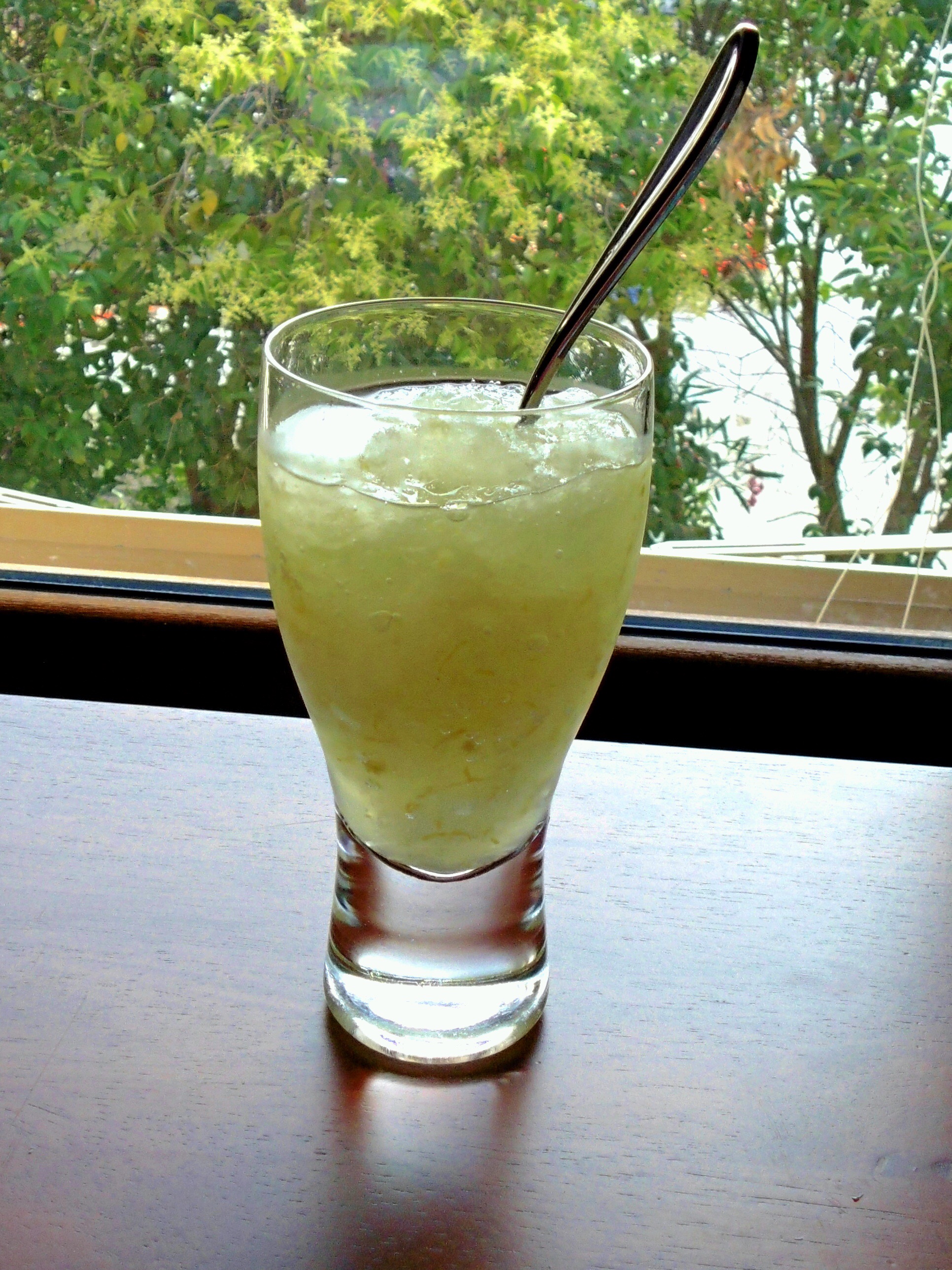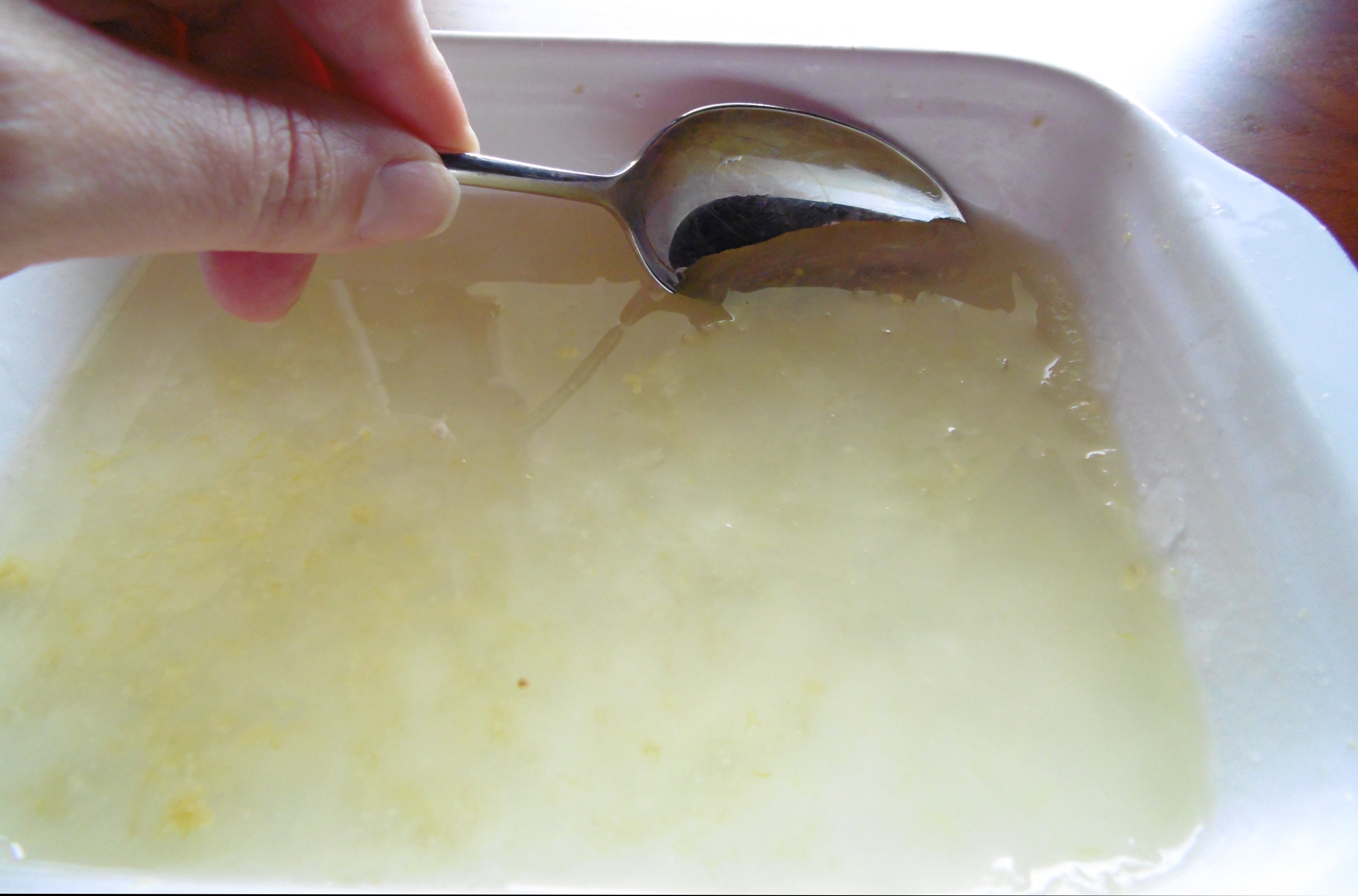 I added a little water from the recently boiled kettle and some sugar and stirred until the sugar dissolved. It is necessary to taste at this point to make sure you have the flavour you want. I was advised that, before the freezing process, the liquid should taste slightly stronger and sweeter than you will want the finished result to be. I added about 100 ml of water and about two tablespoons of sugar which made two small but quite lemony servings. You might want to add more water to the same amount of lemons to make a larger quantity.