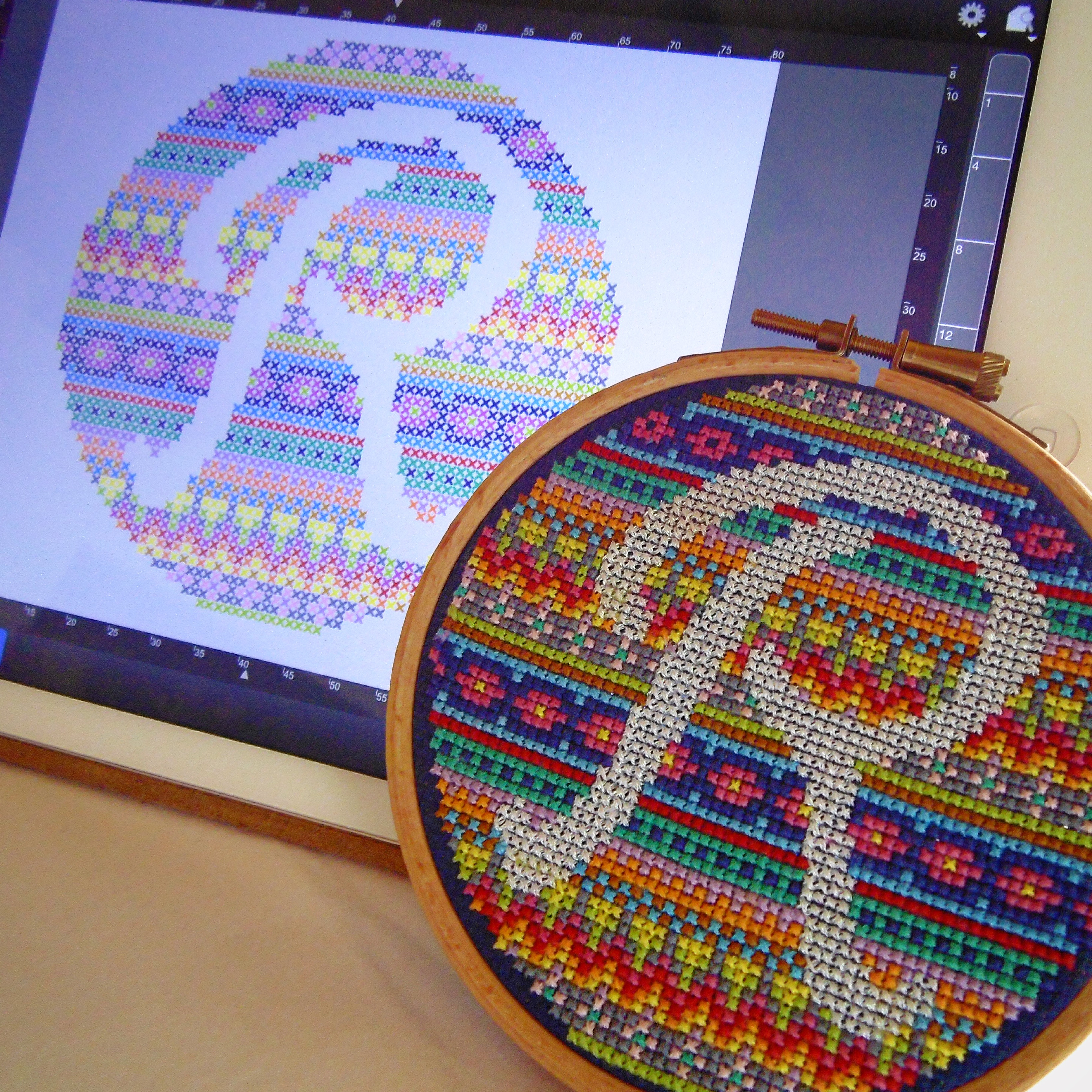 Anyway, my Instagram exchange made me think that I should grab the chance to start making real grown up patterns. I told my IG friend that I would be happy to make up a monogram pattern for her providing she gave me some constructive feedback. She requested this pattern with a letter “R” and so I got to work. I decided that I would make this one up myself so that I was 100% certain I was happy with the colour and composition.